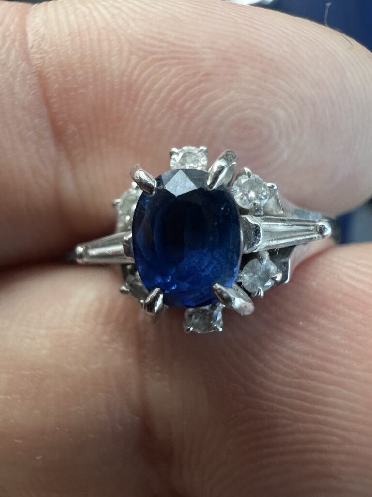 見どころ:オーバルの濃いロイヤル寄りブルー。光の通りが良く、ダーク落ちが限定的。放射状のバゲット取り巻きは80–90年代の人気デザインで現代でも需要があります。