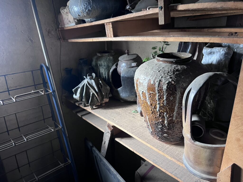 棚には壺・花器・徳利・湯呑などが数十点並び、全体としては「信楽・萩・備前」に該当すると見受けられる系統が中心(※作家名は未特定)。長期保管に伴う埃や表面のくもり、口縁の小カケが一部に見られ、共箱・栞は一部のみという構成でした。