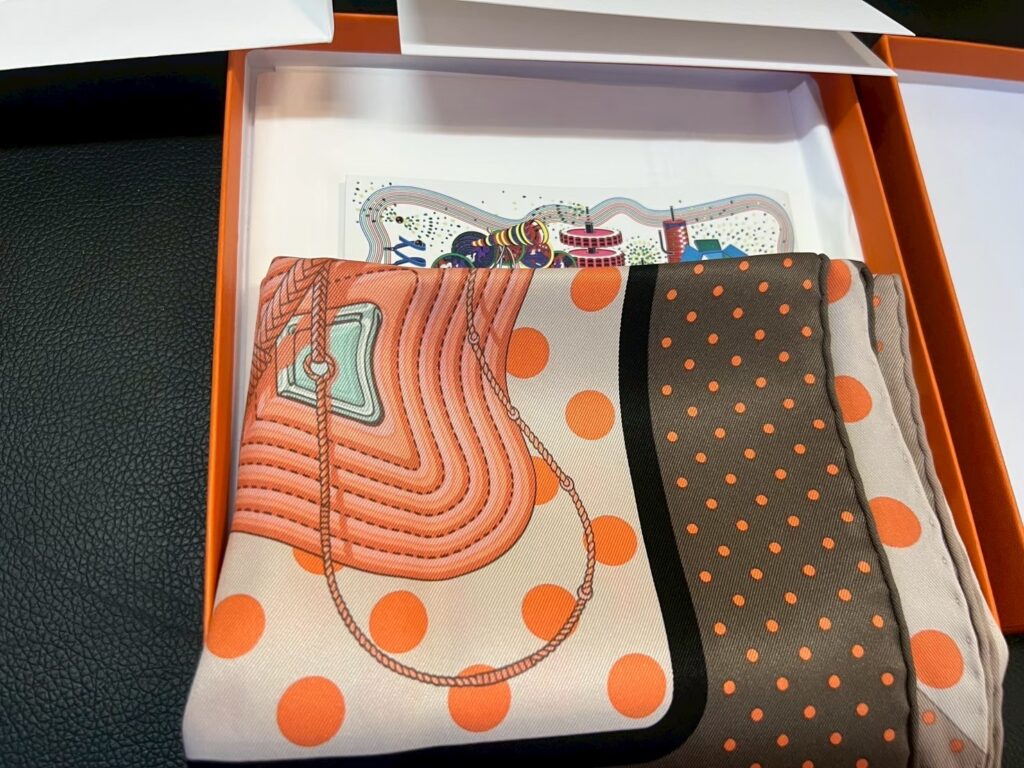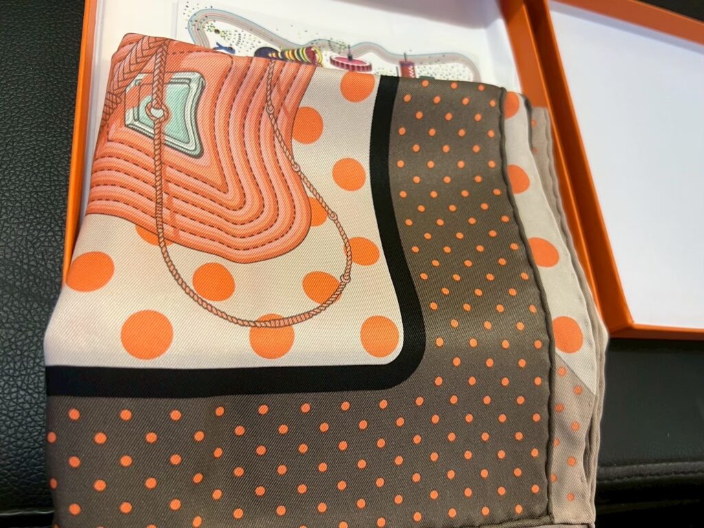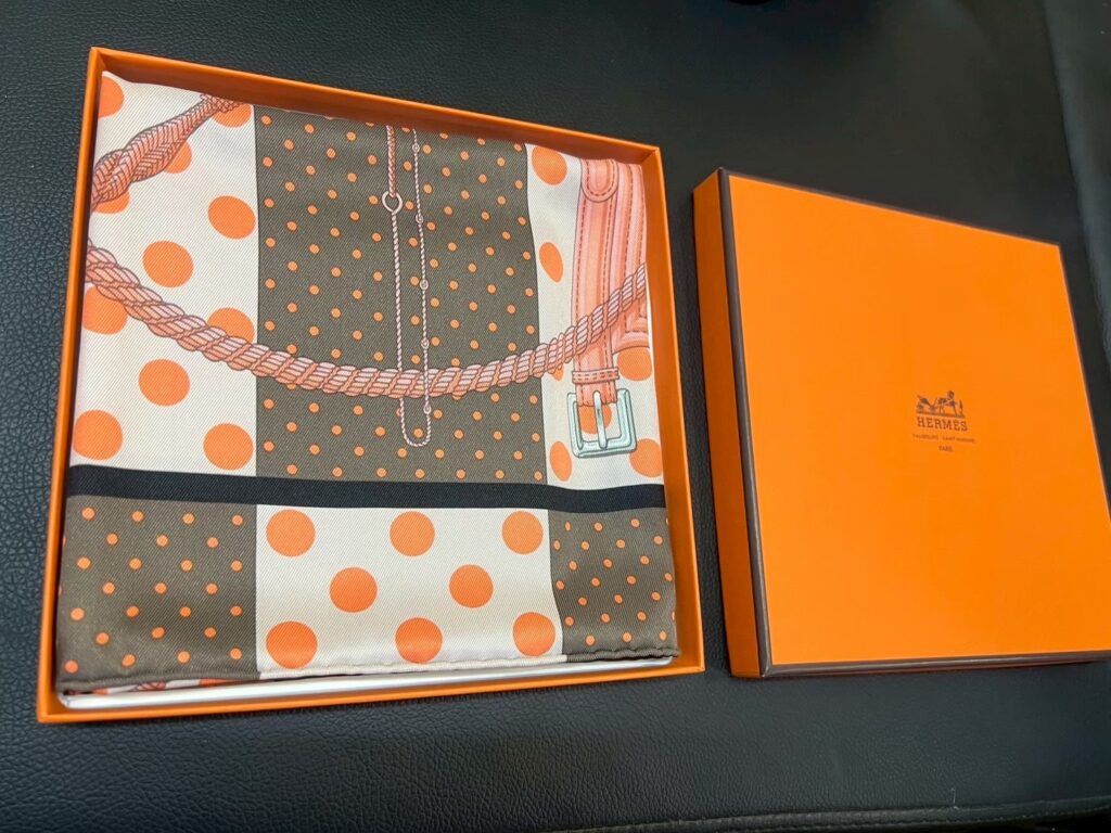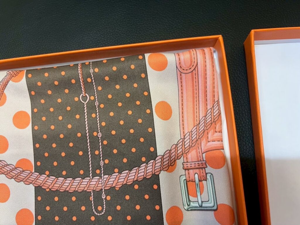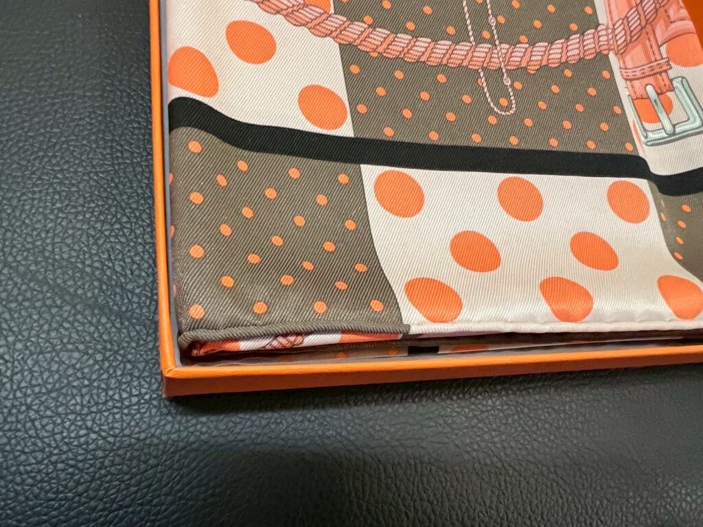 総評:写真範囲ではコンディション良好。縁・発色・付属が強く、実寸90×90cm(カレ90)確定とタグ情報が揃えば、相場上でも評価しやすい個体です。