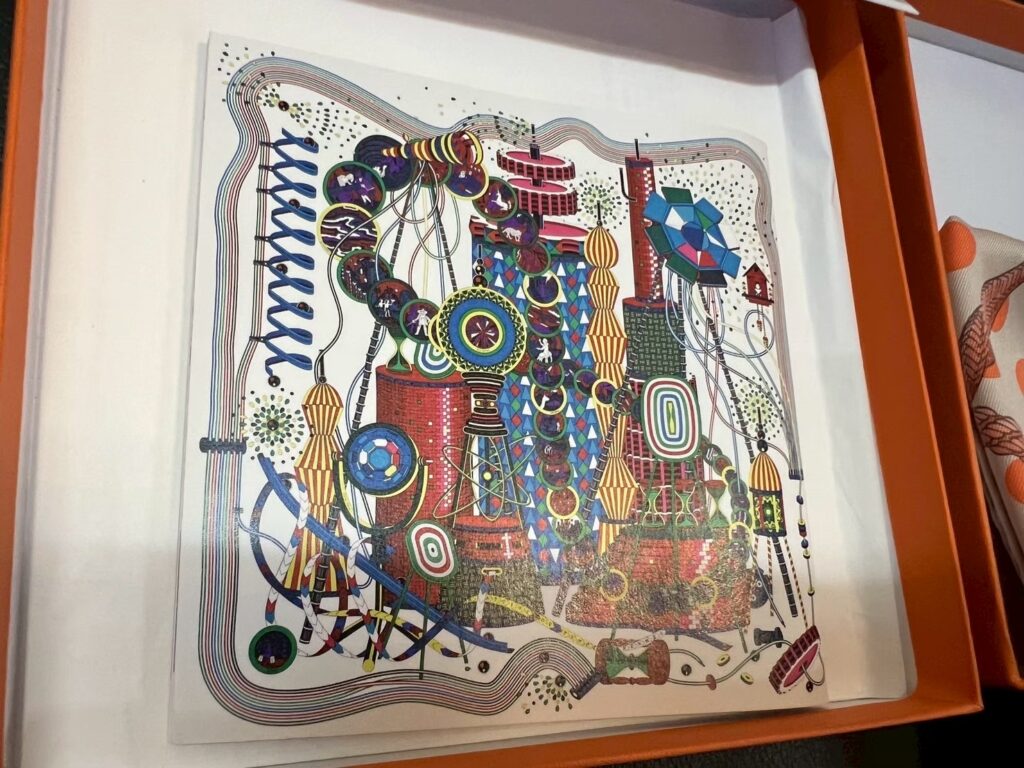 表側へふっくら転がるロールで、縫い目のピッチが均一。ヨレやほつれは写真範囲では見当たりません。エルメスのカレ評価で最重要の箇所です。 - 発色・プリントの輪郭