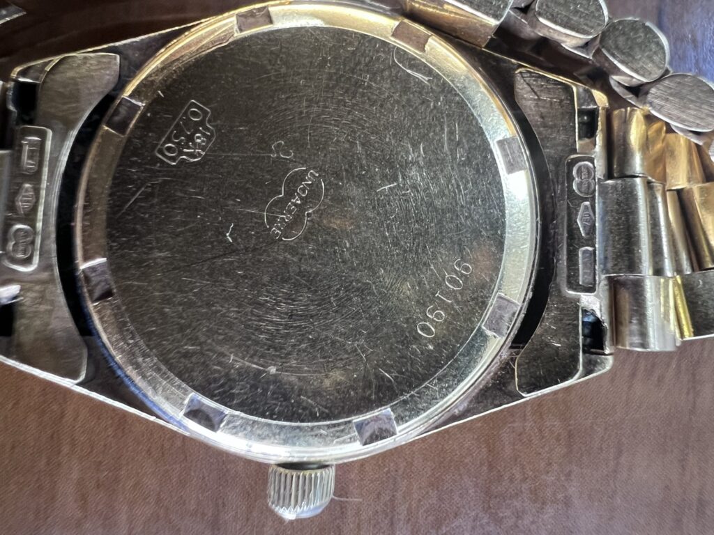 - 刻印:裏蓋に「18K / 0.750」、ブレス各所にブランド刻印を確認